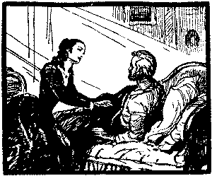 Мисс Вериндер стоит на коленях возле дивана. Она выбрала такое место, чтобы взгляд его, как только он откроет глаза, упал прямо на ее лицо.