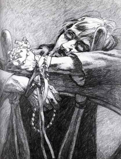 Нет ничего удивительного в том, что береговой сторож был поражен или даже испуган, так как редко приходится видеть такие сцены. Человек был привязан за руки к спице колеса, причем руки его были связаны одна над другой. Между рукой и деревом находился крест, а четки, к которым этот крест был приделан, обмотаны вокруг кистей рук и колеса, и все вместе было связано веревкой. Возможно, что этот бедняк раньше находился в сидячем положении, но хлопавшие и бьющиеся паруса, очевидно, разбили рулевое колесо, и тогда его начало кидать из стороны в сторону, так что веревки, которыми он был привязан, врезались в мясо до самых костей. Были сделаны точные записи о положении вещей, и доктор, сэр Дж. М. Каффин, прибывший сейчас же вслед за мной, после краткого осмотра заявил, что этот человек уже, по крайней мере, два дня как умер. В его кармане была пустая, плотно закупоренная бутылка со свертком бумаги внутри, оказавшимся дополнением к корабельному журналу. Береговой сторож говорил, что он, должно быть, сам связал себе руки, затянув веревку зубами. Затем покойный штурман был почтительно снят с того места, где он стоял на своей благородной вахте до самой смерти, и теперь, внесенный в список мертвых, ожидает следствия.